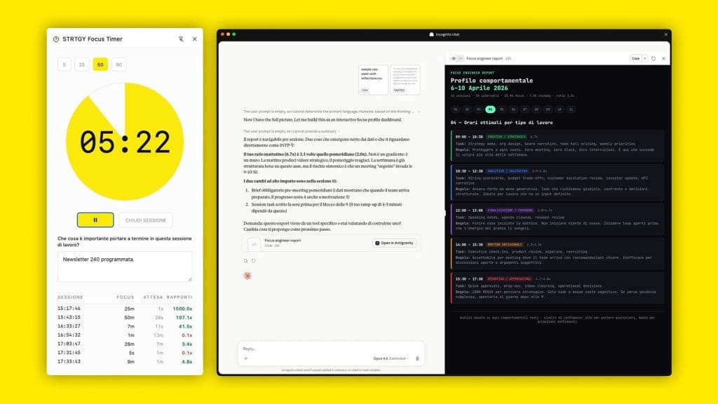 After 1-2 weeks of consistent use, export the CSV and upload it to an LLM with the prompt I’ve specially designed. You’ll receive 11 sections of personalized analysis: from your concentration profile to the best hours for each type of work, from break planning to a daily optimization plan.