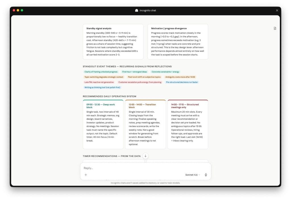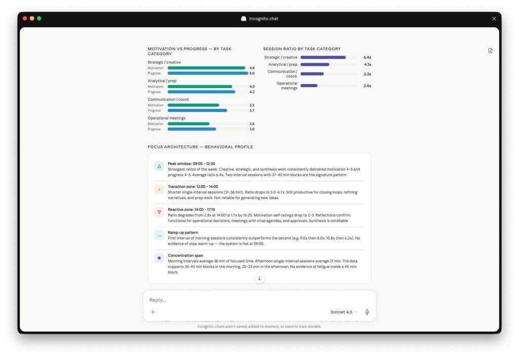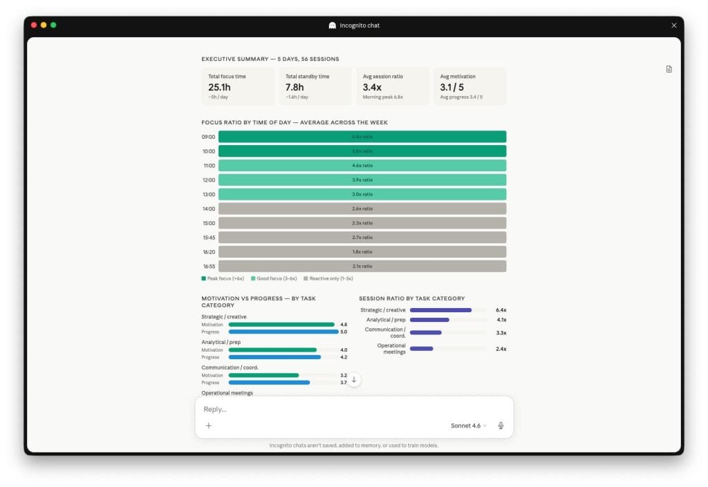 Dopo 1-2 settimane di utilizzo costante, esporti i dati in CSV e li carichi in un LLM con il prompt incluso. Con Claude Opus ottieni una dashboard interattiva in React con grafici navigabili nel browser. Con Claude Sonnet, un report dettagliato in 11 sezioni.