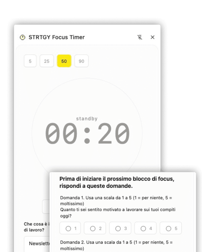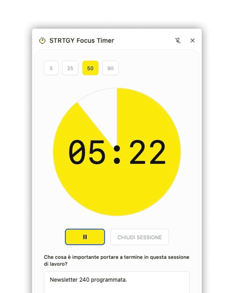 STRTGY Focus Timer ti aiuta a raccogliere quei dati. Ogni giorno, in tempo reale, senza tenere un diario. Sei tu a controllare il processo: avvii la sessione, segnali quando sei in focus e quando ti distrai, e a fine blocco rispondi a tre domande. I dati rimangono nel tuo computer. È un atto di onestà con te stesso, non un software che ti spia.